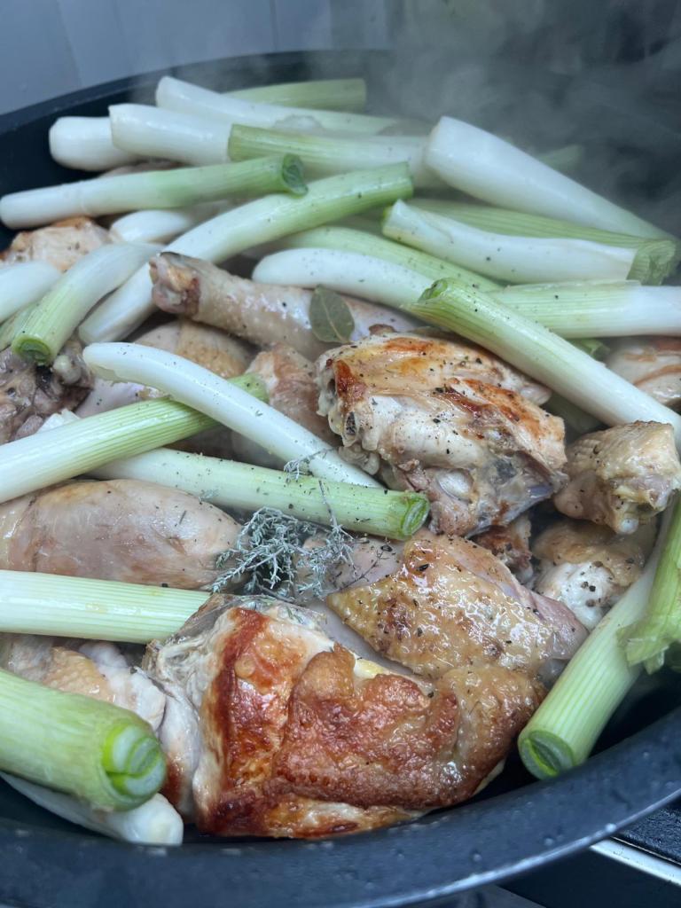 Gall de pota negra amb calçots