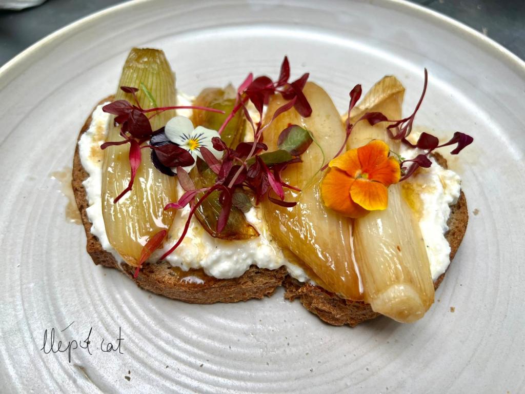 Els calçots confitats queden suaus, dolcets, gairebé melosos amb un punt picant, recordant la torrada que feiem l’any passat, tornada a pensar… com si de cop expliquessin una altra història. I els mini gofres hi posen la part divertida: un punt cruixent, lleuger, que et convida a fer mossegades petites però repetides.
